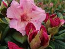 A medium sized Rhododendron with deep pink buds that open to yellow- pink flowers arranged in conical trusses. Narrow, deep green leaves. (Mid- Season)